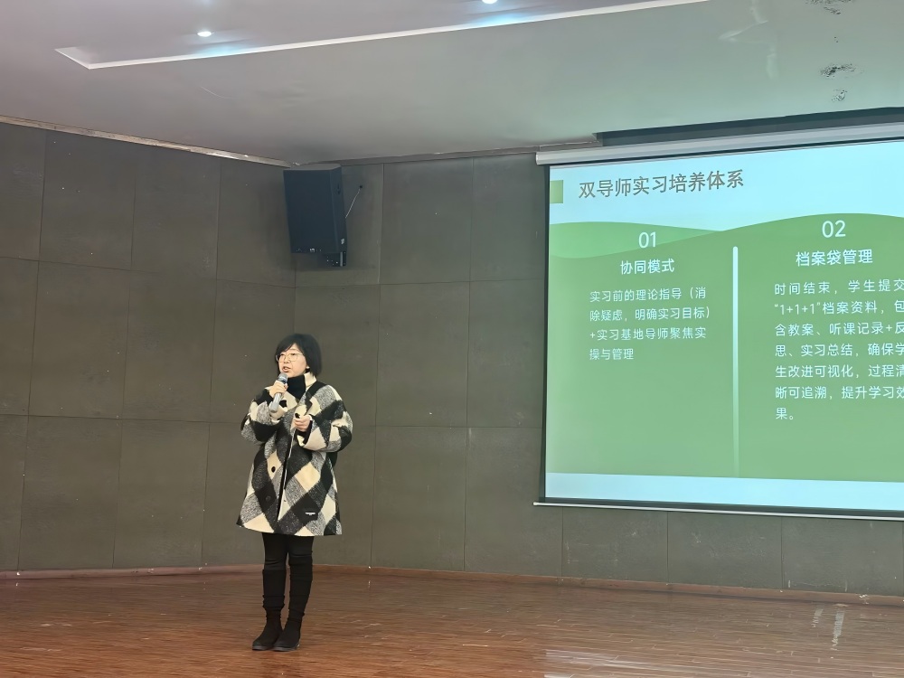 实习指导教师代表赵翊羽副教授在总结中,肯定了全体学子的全情投入,并指出本次实习三大亮点:“双导师制”实现校内外协同育人“1+1>2”的成效,“档案袋管理”与“影子跟岗”保障实践专业性,互动生成式学习显著提升学生反思能力。针对实习中暴露的问题,学院已启动系列改进措施,包括制定前置任务清单、建立优秀实践档案袋范例库、推广“小组复盘+导师追问”机制等。她进一步提出实践教学“五个转变”规划,明确从“周制”到“链式”培养、从“答疑”到“赋能”指导等发展方向,将师范认证标准全程融入培养过程。