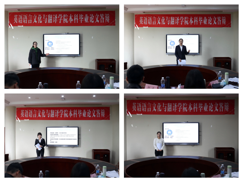 本次答辩分为自我陈述与现场答辩两个环节。在自我陈述环节,答辩学生依次围绕课题价值、研究思路、理论框架、案例分析及研究结论等核心内容进行全面阐述。全体学生全程采用英语脱稿汇报,语言表达流畅自然,充分展现了扎实的语言功底与良好的学术素养。