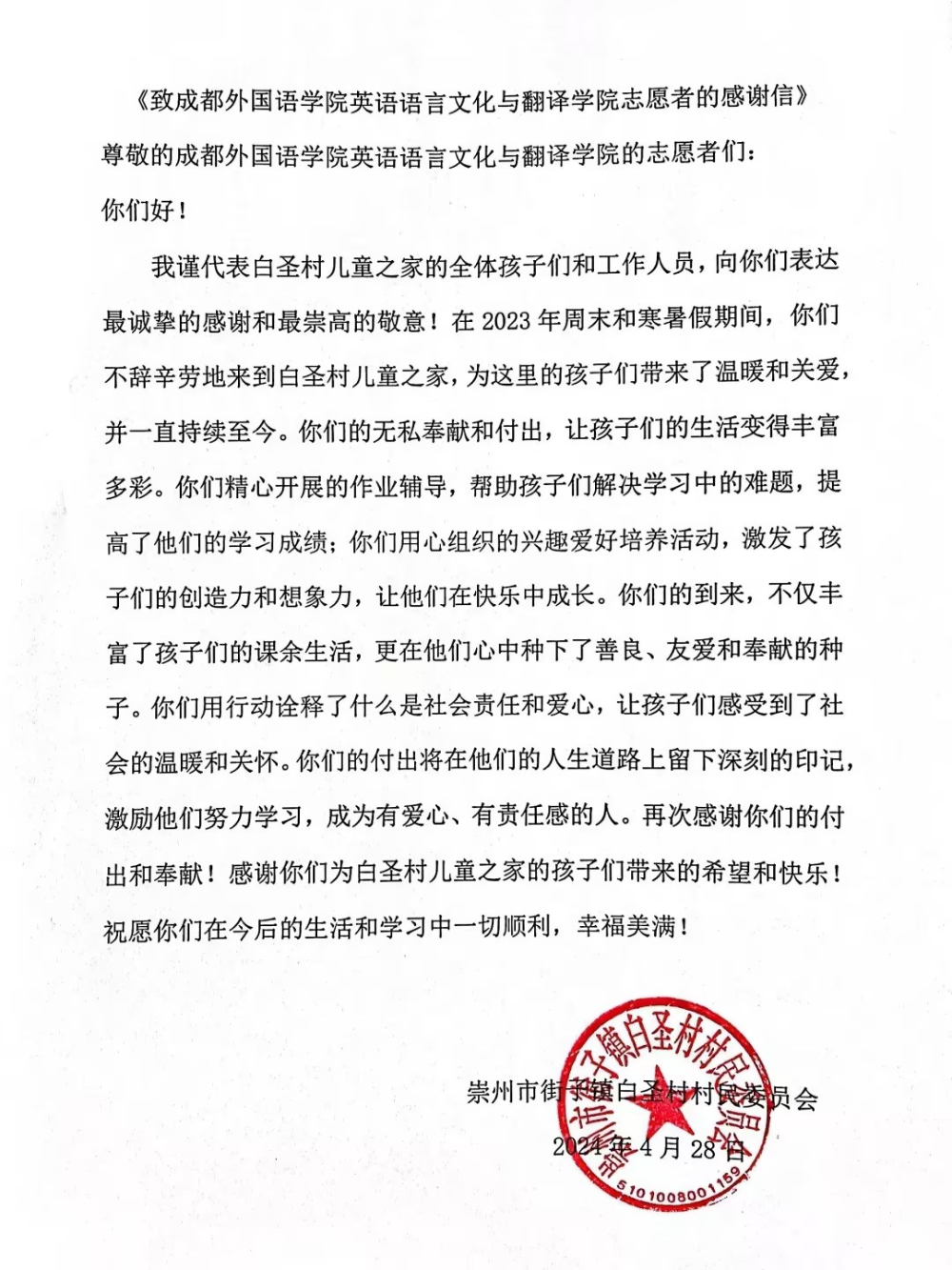 近日,成都市残疾人集中托养(崇州)中心、都江堰市禾苗残疾儿童关爱中心、崇州市街子镇白圣村村民委员会分别向我院发来感谢信,信中高度赞扬了我院学子对弱势群体的关爱,并对我院学子热情友好、积极向上的志愿服务态度表示认可。