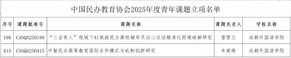 9月1日,根据《中国民办教育协会课题管理办法(2025年修订)》和《关于申报中国民办教育协会2025年度规划课题的通知》规定,经专家评审,我院詹雪兰老师申报的《“三全育人”视域下AI赋能民办高校辅导员谈心谈话精准化困境破解研究》(课题编号:CANQN250188)获批中国民办教育协会2025年度规划课题(青年课题)立项。