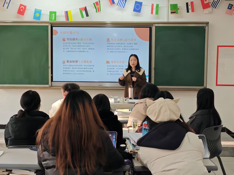 沙龙现场氛围热烈,我院考研部负责人朱颖丽老师作为主讲人,以 “是否考研” 这一关键问题为切入点,引导同学们从专业基础储备、学习自律能力、职业发展目标、家庭经济支撑四大维度开展深度自我评估。朱老师创新性地引入四象限决策模型,通过清晰的逻辑拆解与案例分析,帮助同学们理性判断自身考研适配度,有效规避盲目跟风、目标模糊等常见误区。随后,朱老师围绕国内考研全流程,系统梳理了核心知识体系:从院校与专业选择的 “避坑指南”、考试科目结构的深层解析,到参考书高效查询技巧、报录比数据的解读方法,再到调剂规则的重点梳理,每一项内容都紧扣同学们的实际需求,讲解细致入微。针对备考规划这一核心痛点,朱老师着重强调 “早规划、早准备、早行动” 的重要性,结合不同专业特点,量身定制了从大三上学期起步的全程复习时间表,为同学们搭建起清晰有序、可落地执行的备考节奏框架。