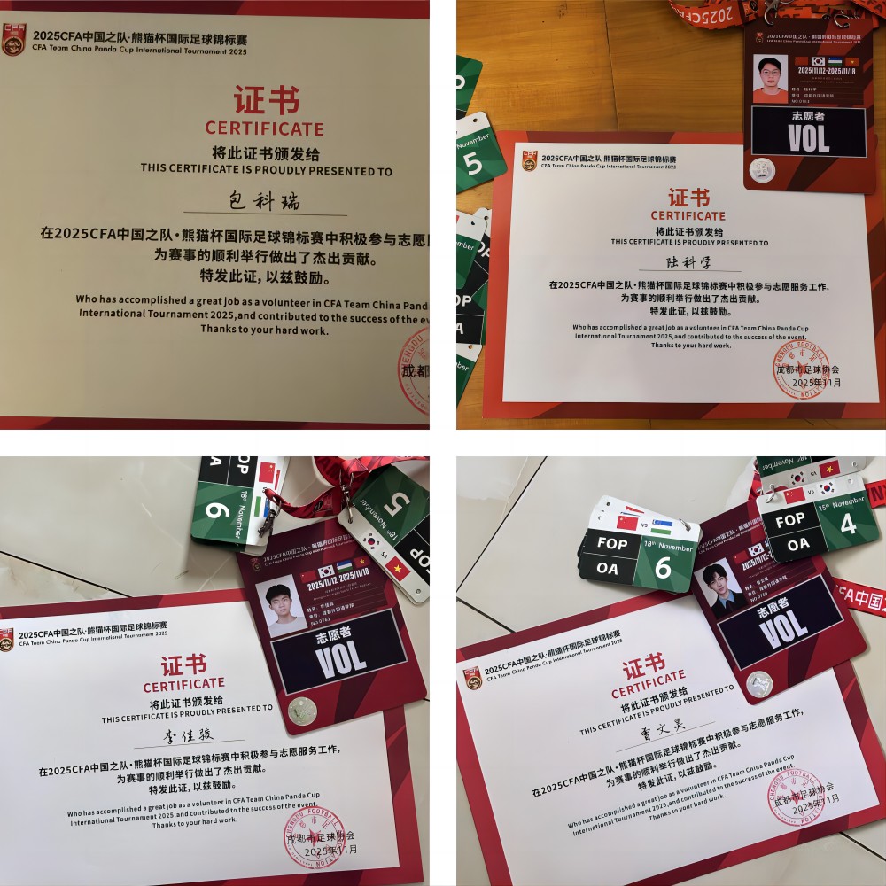 11 月 9 日至 19 日,由中国足球协会、成都市人民政府主办,成都市体育局、双流区人民政府共同承办的 2025CFA・中国之队熊猫杯国际足球锦标赛在双流区圆满落幕。本次赛事为期十日,邀请了韩国、乌兹别克斯坦、越南三支U23国家青年队与中国U23国家青年队同场竞技,在绿茵场上展开激烈角逐与深度交流。英语语言文化与翻译学院马定呈、王涛、胡企;教育与体育学院刘鸿嘉;亚非语言学院曾文昊、李佳骏、包科瑞 、陆科学,共计 8 名学子凭借扎实的综合素养脱颖而出,化身赛事志愿者,全程助力球队与组委会的顺畅沟通协作,成为赛场内外一道亮眼的青春风景线。
